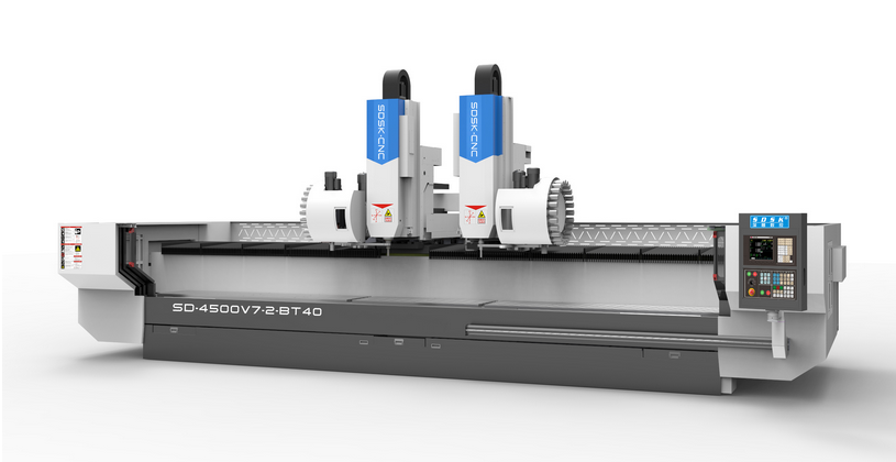 1、SD-4500V7-2-BT40機型系列是專門為客戶量身定做的大型雙頭雙通道型材加工中心; 天車式結構;相當于2臺機器同用1控系統1套床身;可同時加工2個不一樣的工件也可雙頭同時分段加工同一個工件、也可以同時加工2個同樣的工件;Y機頭前后移動,運動機構設計在橫梁頂部輕巧便捷也方便清理,可同時前后移動也可單獨前后移動,2X機頭可同時左右移動也可單獨左右移動2Z主軸可同時上下移動也可單獨上下移動。加工批量產品時可使用雙頭同時加工產品,調試簡單便捷,也可以把X1軸移至機床左側單獨用X2軸加工長行程工件,實現一臺兩用的功能。