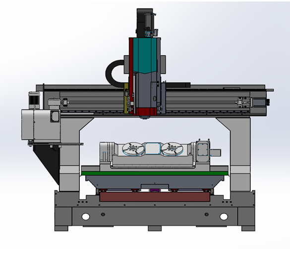 1、SDSK1780YIW-2R-BT30機型是專門為客戶量身定做的AC雙工位搖籃五軸加工中心;定梁式龍門結構; 運動方式為Y軸工作臺前后移動,X軸機頭左右移動,Z軸主軸上下移動,工作臺上配AC雙工位搖籃五軸轉臺,A軸圓盤工作臺可擺動角度±120°,2C軸圓盤工作臺可轉動角度360°